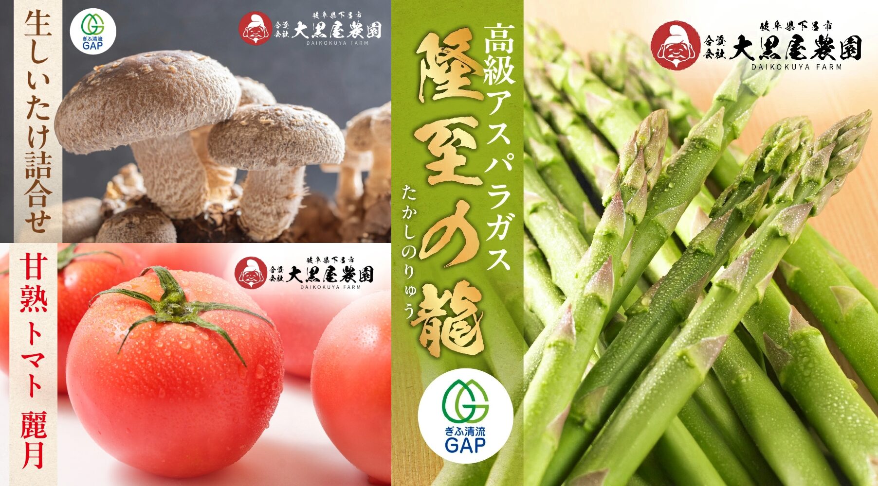 驚きの甘さと太さを誇る高級アスパラガス「隆至の龍」、樹上でじっくり完熟させた濃厚なトマト「麗月」、そして肉厚でジューシーな「菌床生椎茸」。
