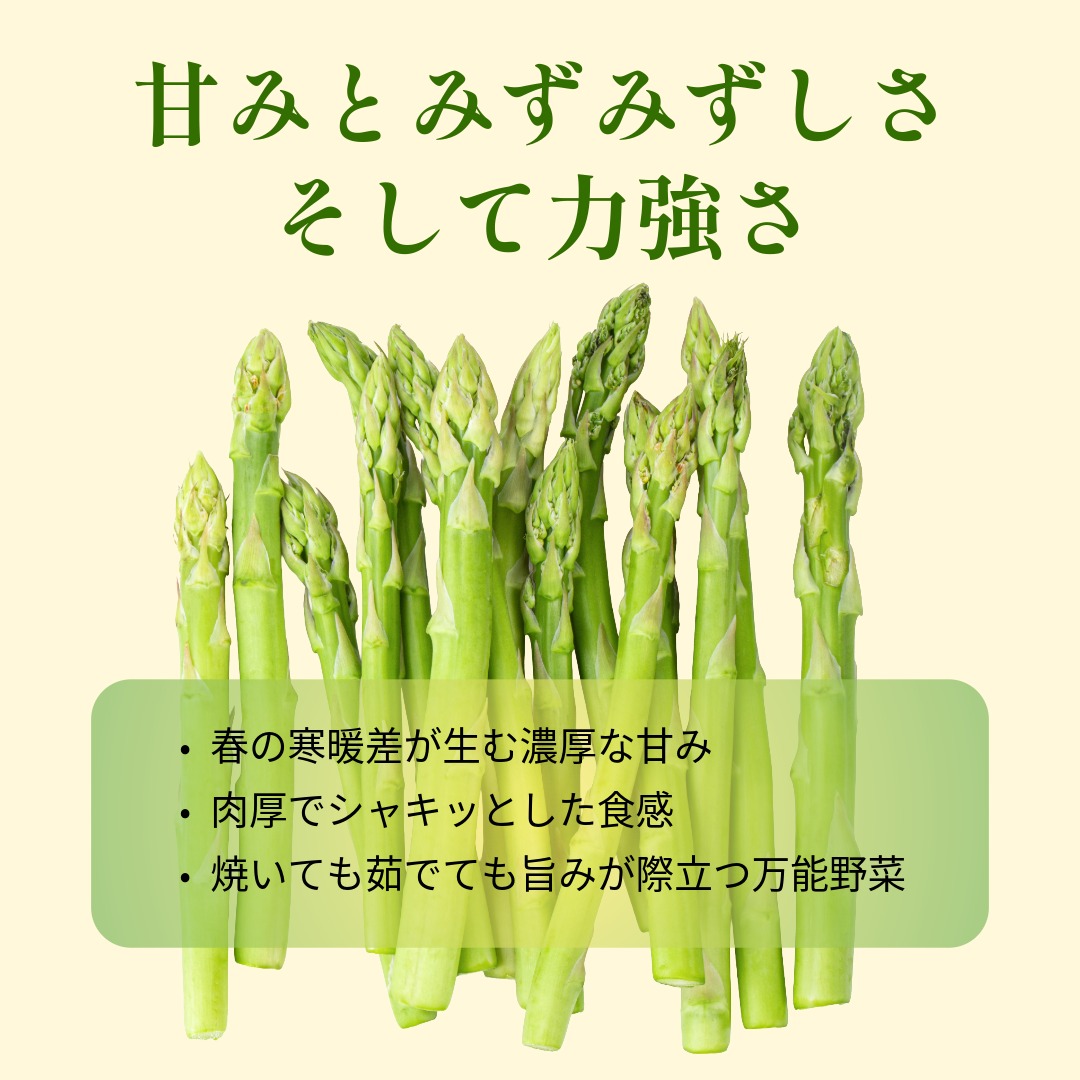 清らかな水と寒暖差のある気候が育むこのアスパラガスは、春の訪れを告げる旬の味覚です。